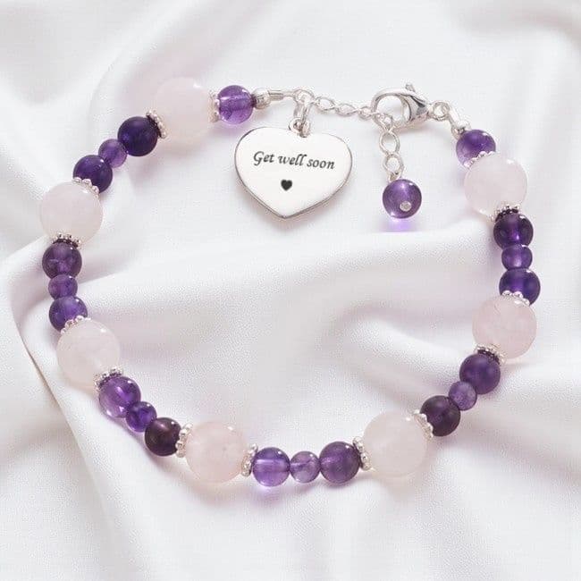 A very high quality, healing after loss bracelet made from genuine semi - precious gemstones of the highest quality and .925 sterling silver, personalised with an engraved heart charm. Beautifully handcrafted with rose quartz beads which are 8mm and the amethyst beads are 5mm and 4mm.