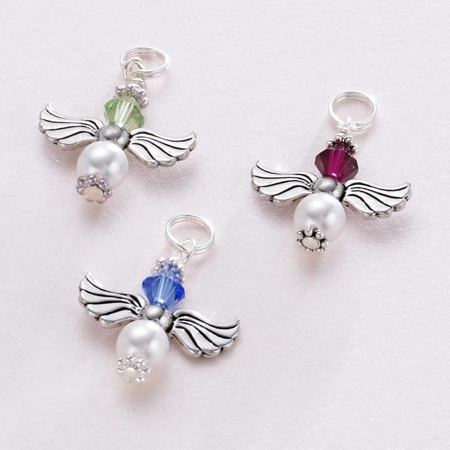 Beautiful little birthstone guardian angel charm made with Preciosa pearls and crystals. Perfect to add to a charm bracelet or necklace.
