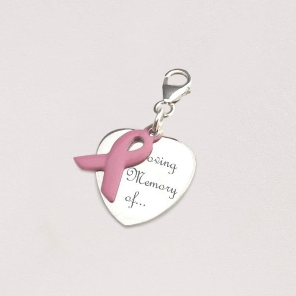 Breast cancer awareness ribbon charm with Engraving on a heart charm, we can engrave up to 25 characters on one or both sides for you.