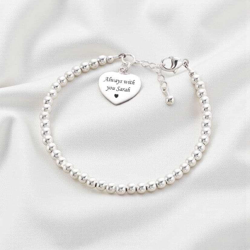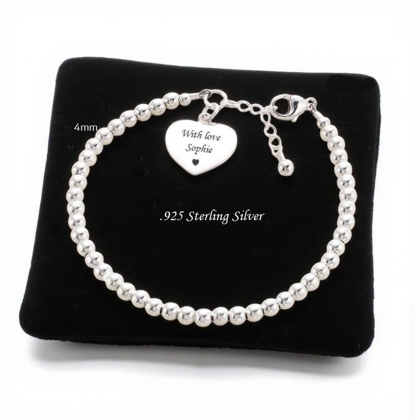 This modern style Sterling silver beaded memorial bracelet with engraved heart is perfect for engraving special names, dates, bible verses or other meaningful words. Often worn with others as stacking bracelets.