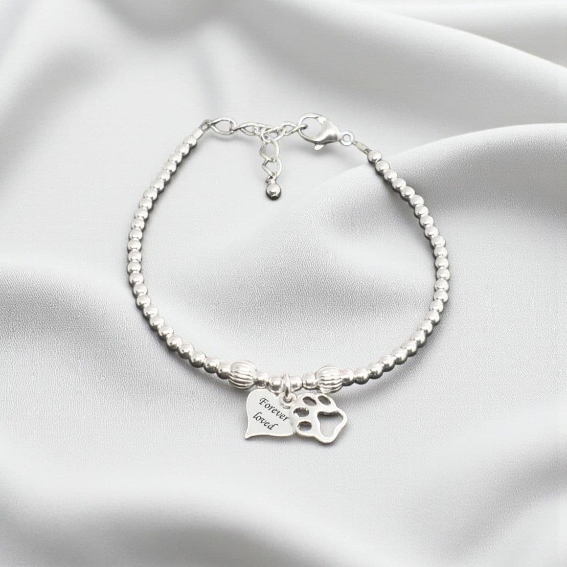 This silver beads bracelet is perfect for engraving any special pet's name on the tiny heart charm which hangs alongside a cute little open Sterling silver paw charm.