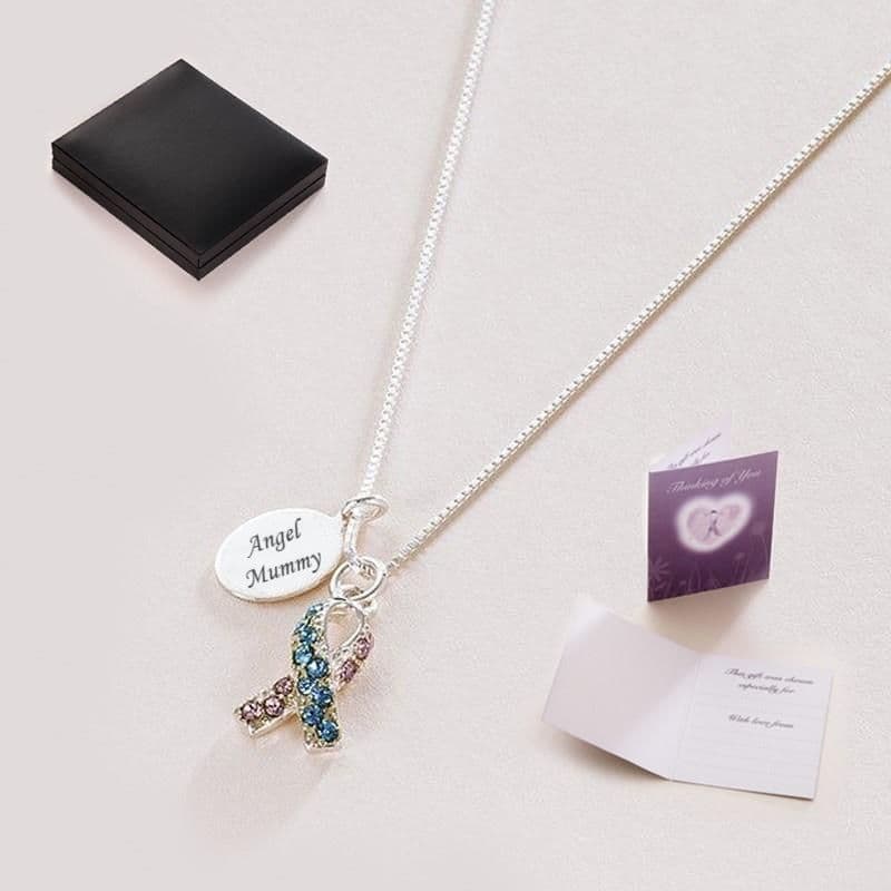 The beautiful awareness ribbon pendant is inset with sparkling Swarovski crystals in pink and blue.