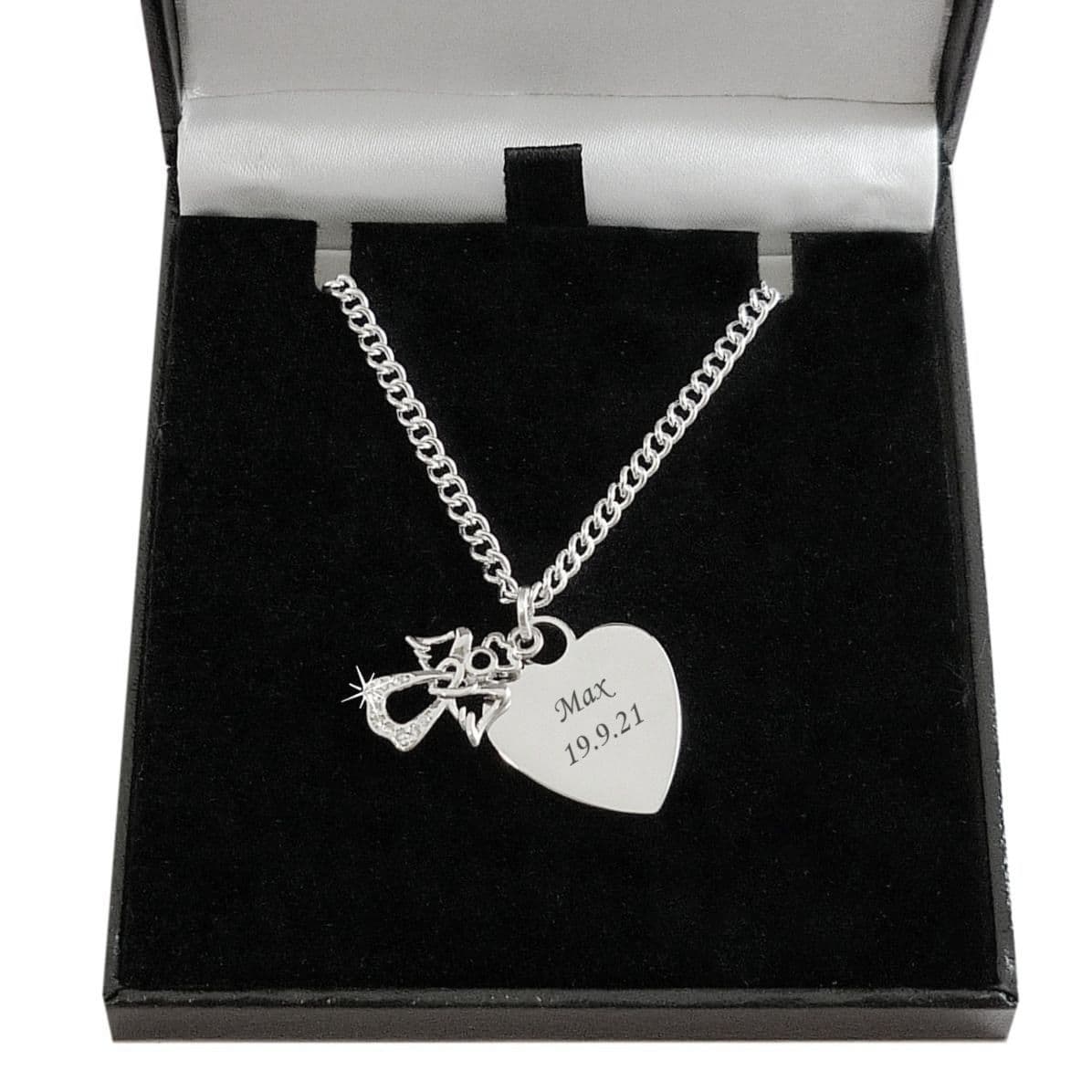 This beautiful high quality necklace featuring a pretty angel pendant with sparkly Czech crystals around the skirt, this sits alongside a personalised heart charm with any engraving of your choice, a thoughtful and meaningful gift.