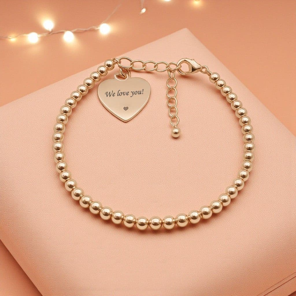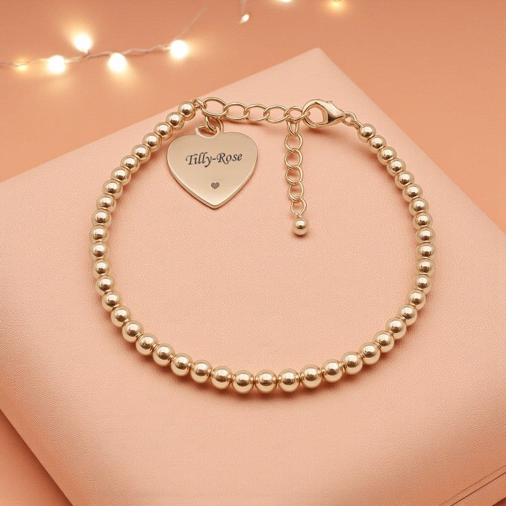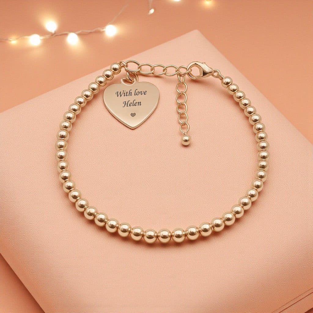 Rose gold beaded memorial bracelet featuring an engraved rose gold heart charm. Free engraving on heart charm. A thoughtful memorial gift, presented in a black, hinged, gift box as shown, with the little gift card shown.